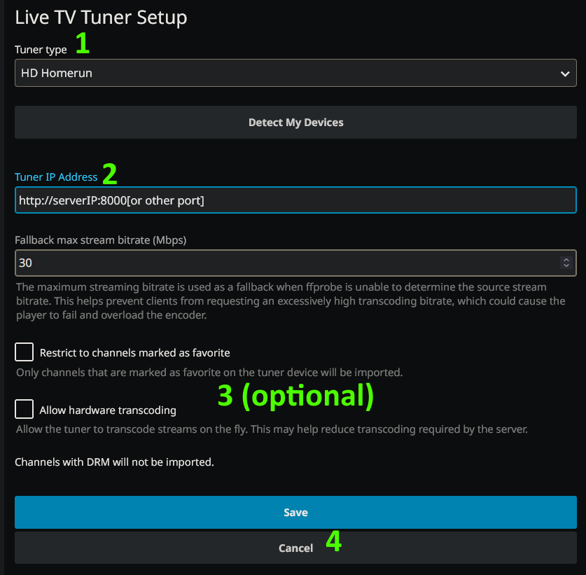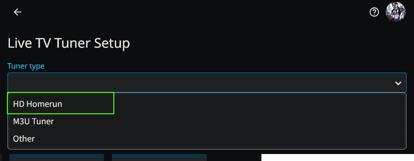 At this point, Jellyfin will ask for your tuner type - we recdommend selecting HD Homerun.