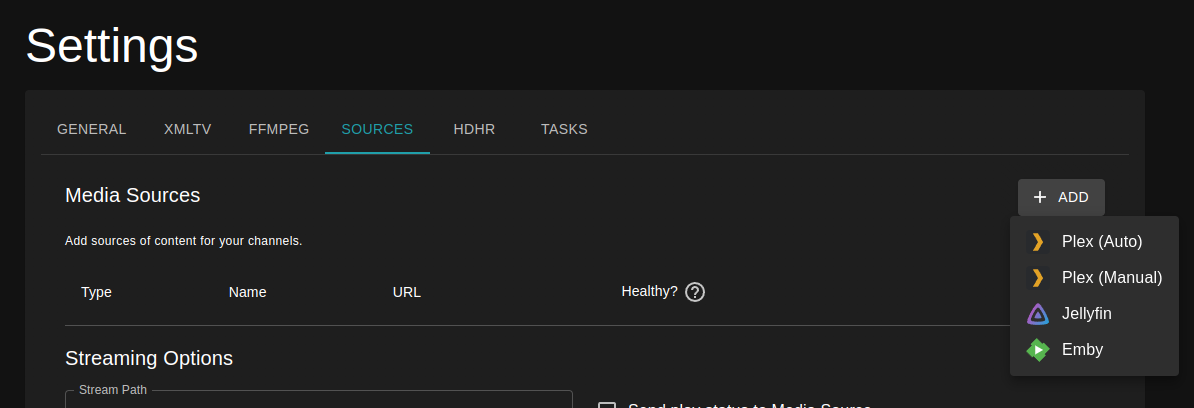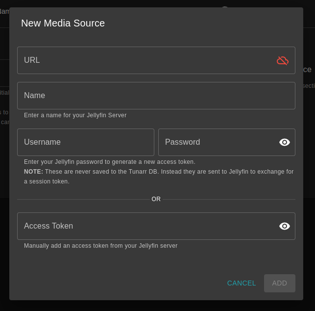 Connect Tunarr to Jellyfin servers by navigating to Settings > Sources. There are two methods of authentication that can be used to connect a Jellyfin server.