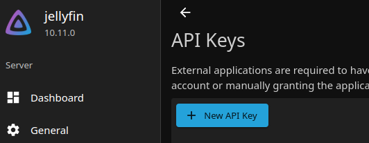 The simplest way to connect Jellyfin is to generate an API Key in the Jellyfin admin dashboard specifically for Tunarr. Navigate to the Jellyfin Admin Dashboard > API Keys and then click "New API Key"